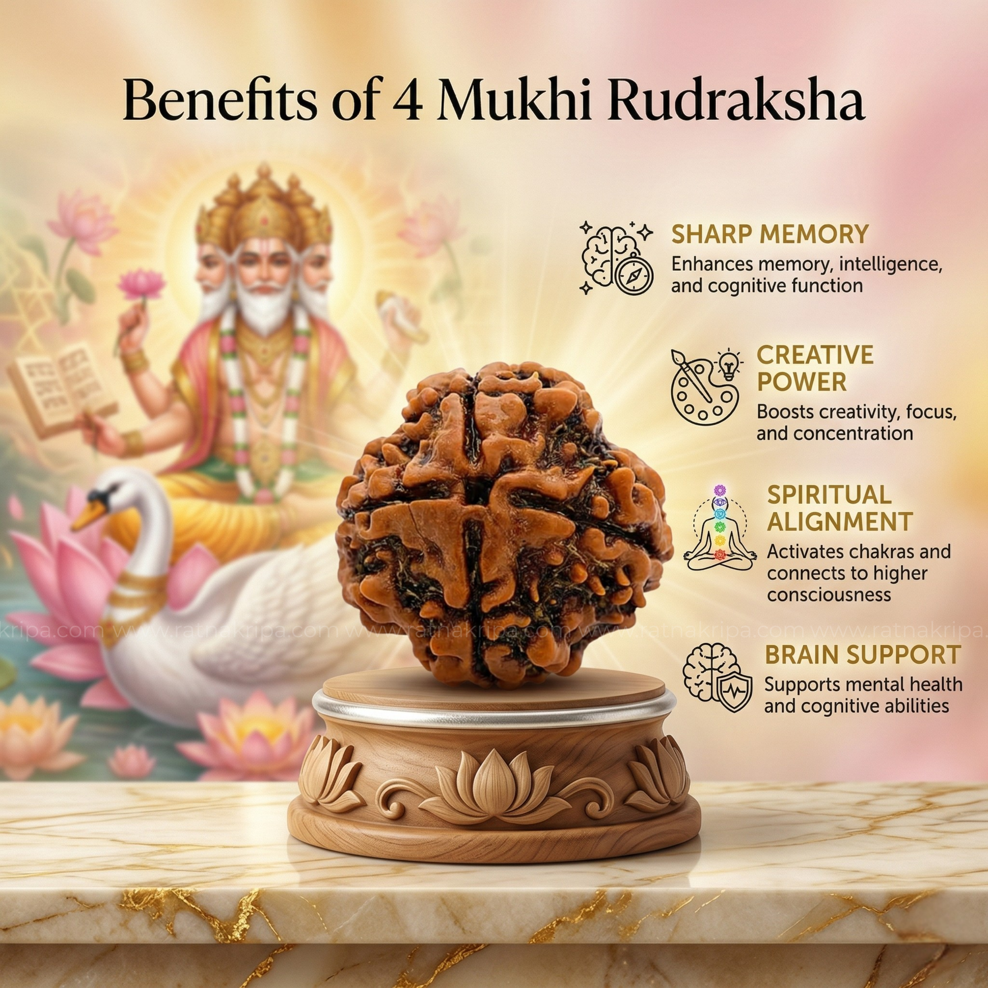 In Hindu mythology, Lord Brahma, the creator deity, blesses this Rudraksha with his divine energy. Each face of the Rudraksha symbolizes Brahma's creative power, wisdom, and omnipresence, akin to his four heads. Wearers of this sacred bead receive Brahma's intellect and creativity, thus facilitating spiritual growth and knowledge acquisition. Just as Brahma shapes the cosmos, the 4 Mukhi Rudraksha guides seekers on a transformative journey towards enlightenment and inner harmony.