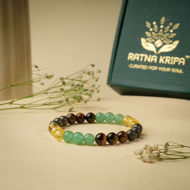 Awaken your abundance & Prosperity with the Money Magnet Bracelet. Made with Citrine, Pyrite, Tiger’s Eye, and Green Aventurine, it boosts wealth, confidence, and positive energy. It balances your Solar Plexus and Heart Chakras to help you attract success, bring clarity, opportunities, and growth along with wealth.